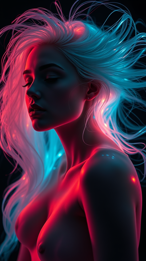 A black background featuring a woman with opalescent hair, embodying the essence of trippy photography and fluid expressionism. Her distorted body and detailed facial features reflect a ethereal presence, with hues of dark white and light cyan weaving through the composition. The scene merges ghostcore aesthetics with glowing pastels, creating an otherworldly atmosphere where light dances along her form, seamlessly blending into her surroundings.