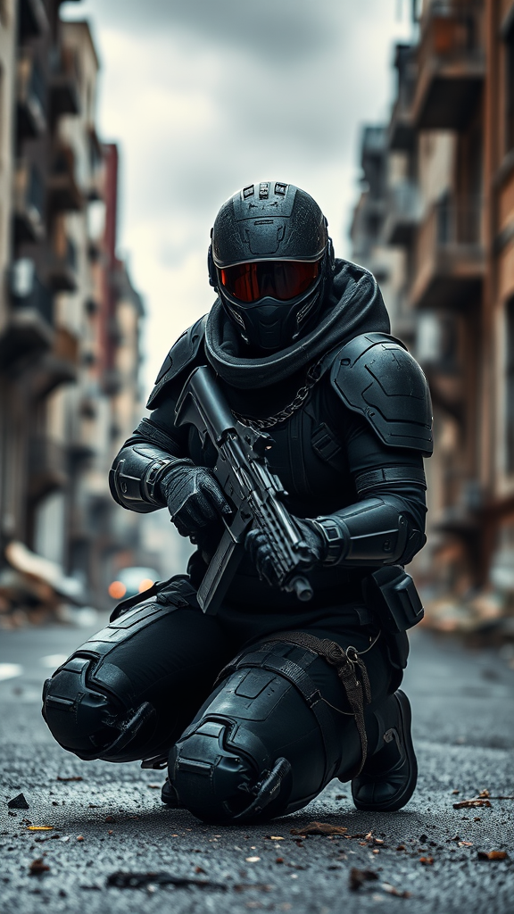 A black female figure in futuristic battle armor kneels on a ruined city street, her cybernetic helmet featuring an intricate sci-fi visor. Her bald head and mask complement the armor's detailed plating and insulation, resembling a spacesuit. She grips a weapon with precision, her posture exuding readiness and focus. The setting is overcast, casting natural light and shadows that enhance the photorealistic textures. The scene captures a cinematic, third-person perspective with a subtle blur effect and the intricate details emphasized through advanced ray tracing and ultra-HD quality. The moody, cinematic lighting creates a high-drama atmosphere, portraying a detailed narrative in an 8K resolution.