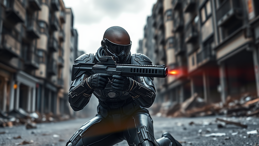 A black female figure in sci-fi battle armor kneels, her cybernetic helmet gleaming under an overcast sky. Her bald head is partly obscured by a sleek, futuristic visor, and a high-tech mask covers her face. She aims a sophisticated weapon, her pose a study in precision and focus. The armor blends advanced technology with insulated plate elements, resembling a form-fitting spacesuit. Intricate details ripple across the surfaces, a testament to cutting-edge design. She is on a ruined city street, its decay captured in photorealistic quality with natural textures. The scene is lit by moody, cinematic light that casts soft, natural blurs around the edges. Rays of light dance across the shot, enhanced by cinematic rendering and ray tracing, producing a highly detailed 8K Ultra-HD image. The perspective is third-person, with a blur effect and long exposure that bring depth to the composition, echoing the atmospheric tension of a sci-fi movie style.