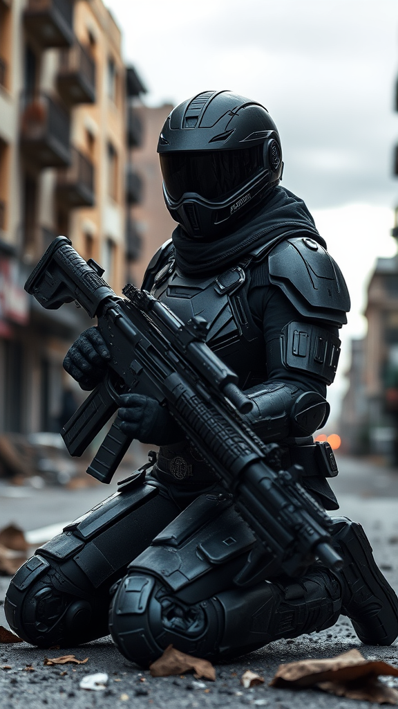 A black female warrior, clad in intricately detailed sci-fi battle armor, kneels on a war-torn city street. Her sleek cybernetic helmet, complete with a futuristic visor, conceals her identity while revealing her bald head. Armed for combat, she expertly holds a high-tech weapon, every piece of her fitted plate and insulated armor glinting under the soft, overcast sky. The scene exudes a photorealistic and cinematic quality, revealing natural textures through subdued lighting and a gentle blur, evoking a sense of resilience amidst chaos. This moody, ultra-HD tableau captures the essence of a dystopian future, presented with a third-person perspective and enhanced by cinematic lighting and precise ray tracing, offering an 8K ultra-detail view.