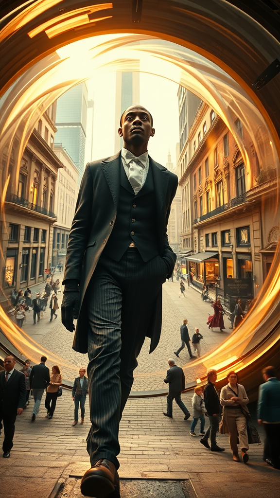 A black man, adorned in an authentic Victorian suit, emerges from a swirling time portal into a bustling modern city plaza. Filmed from a low angle, the camera captures his expression of wonder and confusion as he surveys his new surroundings, with the Victorian-era cobblestone courtyard still visible through the portal behind him. The scene is in stunning 8k resolution, highlighting every intricate detail in both the foreground and background. The plaza teems with people and futuristic technology, creating a stark contrast to the man's period attire. Warm, golden light bathes the scene, adding a surreal quality. The composition follows the Golden Ratio, with the man as the focal point, surrounded by buildings and people in a balanced arrangement that emphasizes his isolation in this unfamiliar world. The visual style combines photorealism and dieselpunk aesthetics, promising an awe-inspiring experience. Directed by Christopher Nolan, this scene is part of an epic, genre-defying film, capturing the essence of the time-travel genre with unique visual flair. The shot is hyperrealistic, with detailed skin, soft lighting, and heavy shadows, aiming for an ultra-realistic masterpiece in film photography.