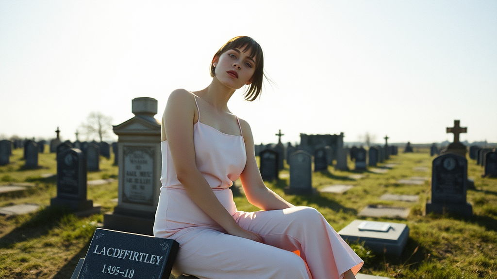 A black metal-inspired pastel goth wearing a pale pink outfit sits gracefully on a tombstone, the intense direct sunlight casting dramatic shadows across her face from the side. Her ethereal appearance is accentuated by her lack of eyebrows, adding an intriguing edge to her look. The scene is captured on Kodak Portra 800, enhancing the soft pastel hues and intricacies of the atmosphere. In the background, the cemetery lies serene under the brilliant sun, with a gentle breeze adding life to the otherwise still landscape, creating a perfect juxtaposition of delicate and dark elements.