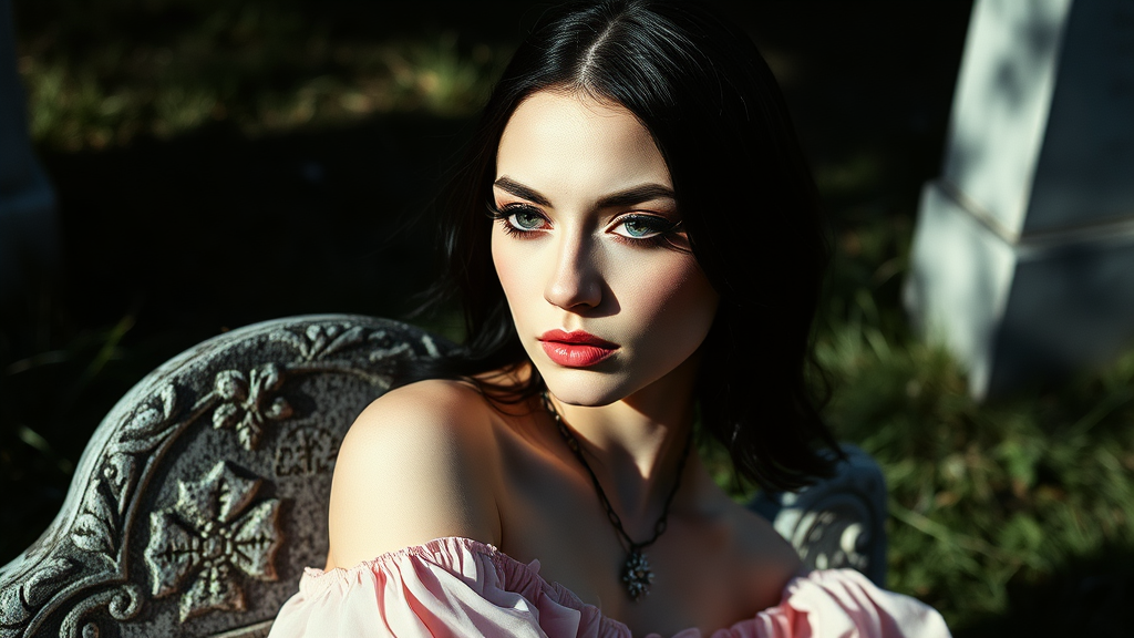 A black metal inspired pastel goth with an emphasis on pale pink, sitting gracefully on a weathered tombstone. Intense direct sunlight casts dramatic shadows across her face from the side. Her expression is serene and mysterious, with striking makeup highlighting her features, and notably absent eyebrows. The setting exudes an ethereal blend of darkness and whimsy, enhanced by the play of light. The image captures a surreal atmosphere, reminiscent of a vintage Kodak Portra 800 photograph, with its rich color tones and a juxtaposition of the dark and pastel elements.