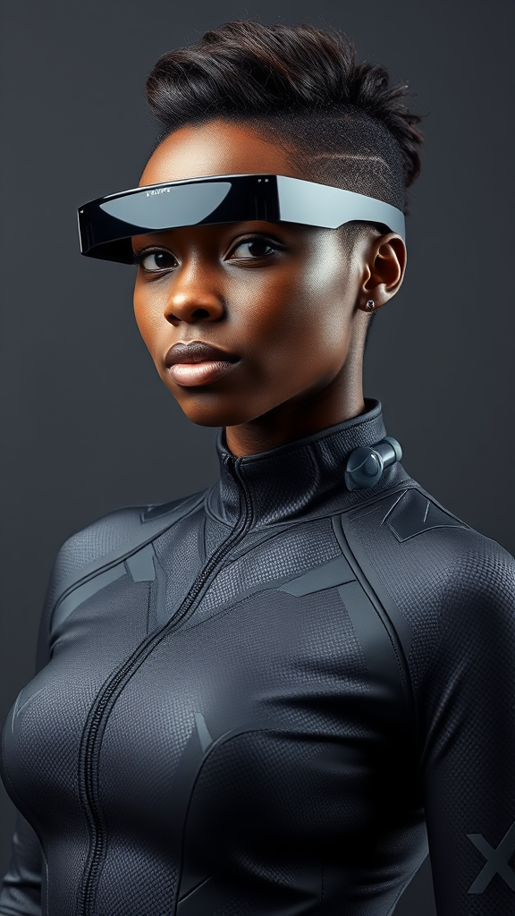 A black woman in sleek, futuristic techwear, the fabric intricately textured with subtle geometric patterns, her expression confident and focused. Her hair styled in a modern, edgy cut, accentuating the contours of her face under ultra-realistic studio lighting that highlights her features with precision. The ensemble is complemented by high-tech accessories, like an advanced smartwatch and augmented reality glasses, adding depth and personality. The scene exudes a sense of innovation and empowerment, with attention to every minute detail and a hyper-realistic finish.