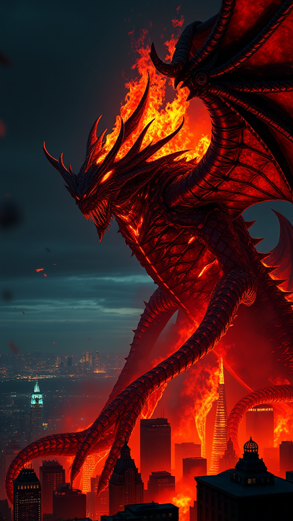 A blazing Deathwing towers over the city, engulfed in roaring flames that pierce the night sky, crafted with the intricate precision of zbrush artistry. The beast's dark bronze scales glisten with a red glow, reflecting an inferno of destruction. Its spiky mounds and armored exoskeleton tell tales of chaos, meticulously detailed in a style reminiscent of crowcore. The creature's exaggerated, wrathful expression captures the essence of stunning art by Bayard Wu. The city below is a silhouette against the fiery backdrop, with shadows dancing as the flames flicker. Surrounding embers catch the wind, creating a dynamic scene that teeters on the edge of apocalypse.