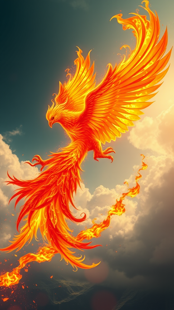 A blazing phoenix soaring through the skies, leaving a trail of vibrant flames, revives the land it touches, renewing life in its wake.