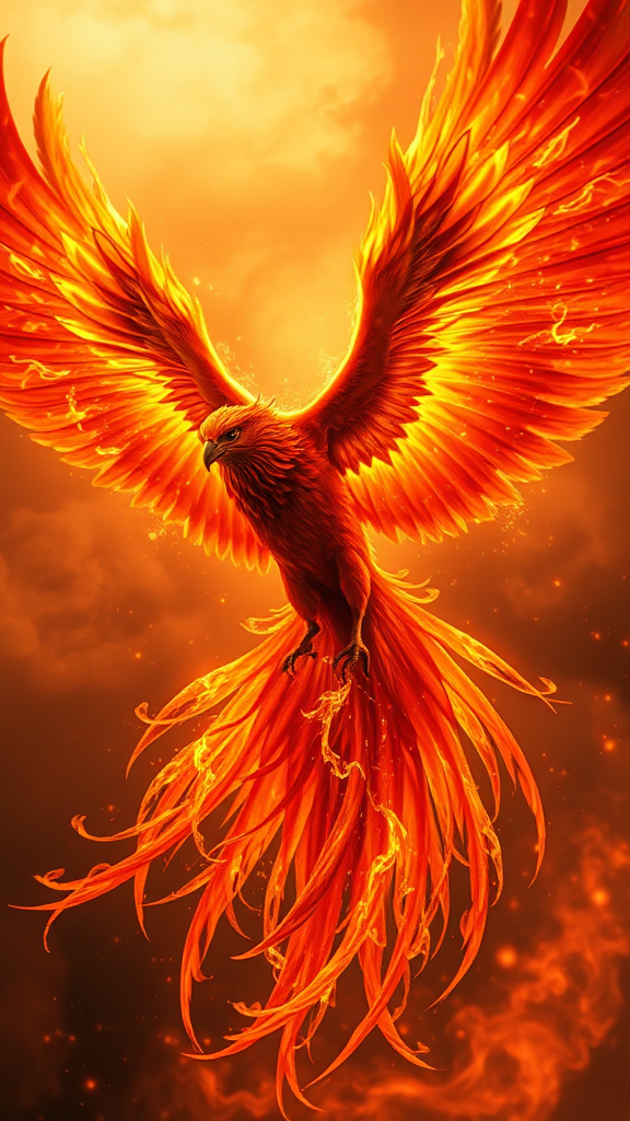 A blazing phoenix soars through a fiery sky, its magnificent wings leaving trails of ember and ash, a mesmerizing spectacle of rebirth and transformation, the essence of renewal captured in its fierce gaze.