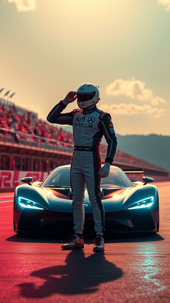 A blazing summer sun casts neon hues over the race track where an electric car adorned with a luminous auto club insignia idles restlessly. Beside it, a racer clad in a sleek, cyberpunk racing suit secures his visor with one hand while his other hand gestures a wave to the adoring, digitally-enhanced crowd. The vehicle's cockpit is intriguingly empty, hinting at advanced AI control. Fans throng the stands, their augmented reality devices shimmering, capturing every moment as the scene is filmed from an elevated perspective, combining a side and front view. The track pulsates with the electric energy of the future, blending the thrill of racing with the vibrant, glowing aesthetics of a cybernetic world.