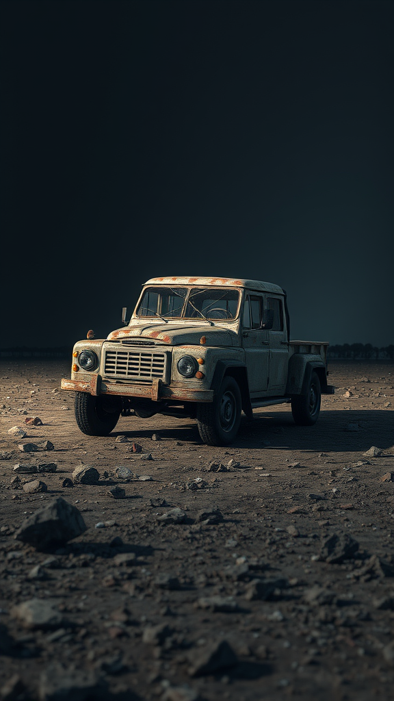 A bleak and barren landscape with fragments of rubble scattered across the ground features a vehicle looming in the shadows. Its metal body is battered and rusted, suffering from years of neglect. The tires lie flat, and the windshield is shattered. The scene, rendered in 3D with a focus on texture and detail, evokes a sense of abandonment and decay, with visual elements that hint at imperfection and distortion, creating a hauntingly surreal atmosphere. The overall aesthetic is marred by artifacts, adding to the eerie and unsettling vibe.