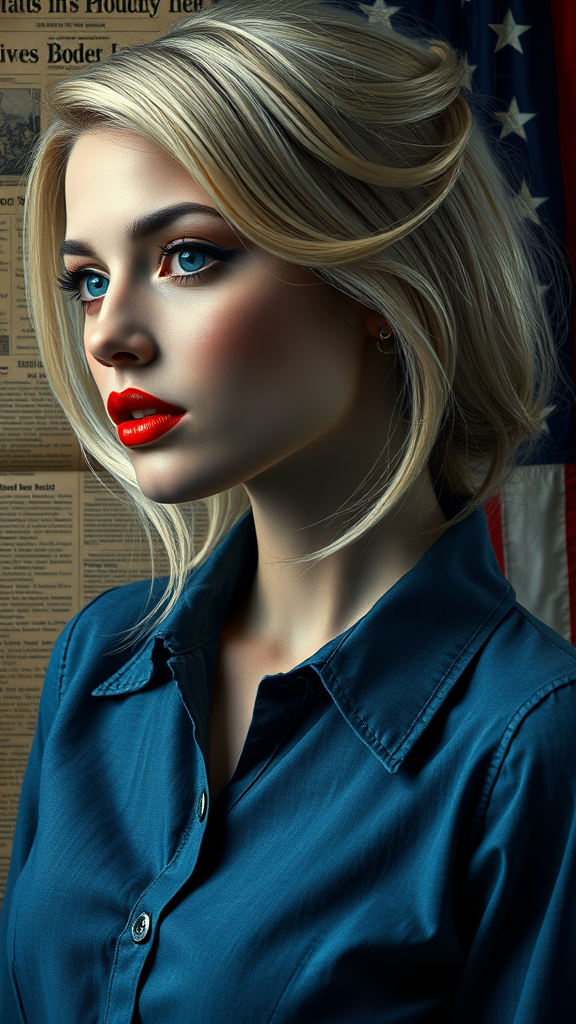 A blend of fresco, realism, and pop art with accents of blue, white, and red featuring a close-up of a stunning blond woman in a collared oxford dress with striking red lipstick. She appears against a backdrop of vintage newspaper and an American flag. The image captures a black and white intimate moment, reminiscent of the styles of Mike Deodato and Jan Frans van Bloemen. Her slender form exudes gentle lyricism, with lush and detailed textures, tenebrism influences, and a touch of emotional distortion. Evoking the artistic spirit of Anton Fadeev, Lauren Faust, and Léon Bakst, the portrait maintains a sense of close-up emotional expression and visual depth.