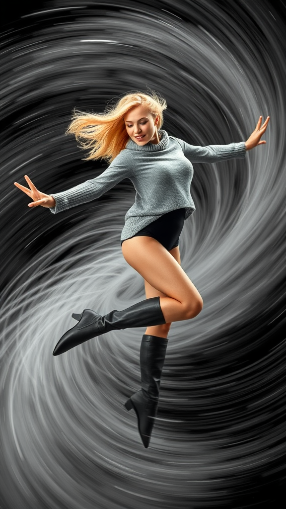 A blonde-haired superhero in a grey sweater and black leotard with bare legs and high boots performs an elegant twirl. As she spins, the whirlwind around her intensifies, creating stunning wind effects reminiscent of a powerful tornado spiraling around her. Her fast spin suggests the manifestation of time travel, a solo feat that merges grace with incredible speed. This masterpiece captures a moment frozen in time, where skill and power collide, reflecting an agrias of dynamic motion and highleg prowess.