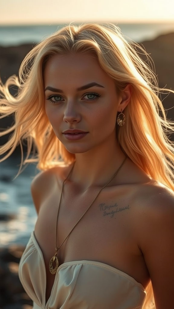 A blonde woman with flowing, sunlit hair stands gracefully on the shoreline, her presence bathed in a palette of dark gold and light bronze hues. The radiant clusters of sunlight play across her skin, casting flattering, ethereal light. She is adorned with modern, exquisite jewelry, each piece a testament to the effortless elegance found in the French countryside. Her youthful energy radiates, a unique spirit captured in the one-of-a-kind accessories she wears, blending seamlessly with the tranquil yet vibrant coastal surroundings.