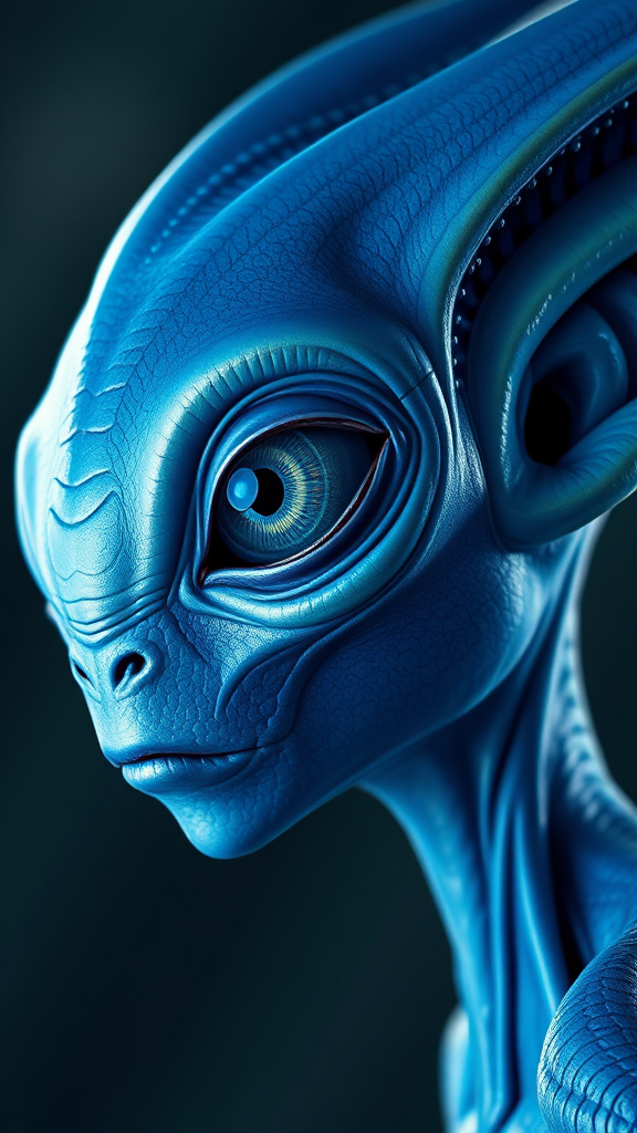 A blue alien with a single large eye and prominent ears, featuring a vibrant palette and centered in a highly detailed composition. The character exhibits an intricately designed face with symmetrically detailed skin, rendered with cinematic lighting to enhance its epic sci-fi and fantasy appeal. Presented in hyper-realistic and ultra-realistic detail, the image boasts an 8K resolution, capturing every nuance in sharp focus. This digital painting masterpiece channels the mdjrny-v4 style, ensuring a modern and polished finish in the side view, while maintaining the essence of an otherworldly, visually stunning creature.