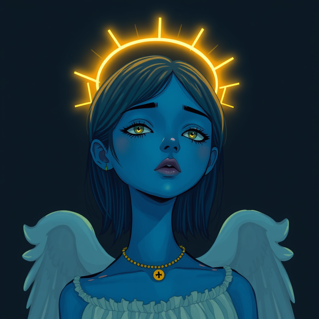 A blue-skinned girl with a mesmerizing golden angel halo, depicted in the style of neon realism, blends dark romance with simplistic cartoon elements. Her presence evokes a brooding mood, merging dark white and vibrant yellow hues in a solarpunk vision. The result is an astonishingly beautiful scene that captivates with its minimalistic yet evocative allure.
