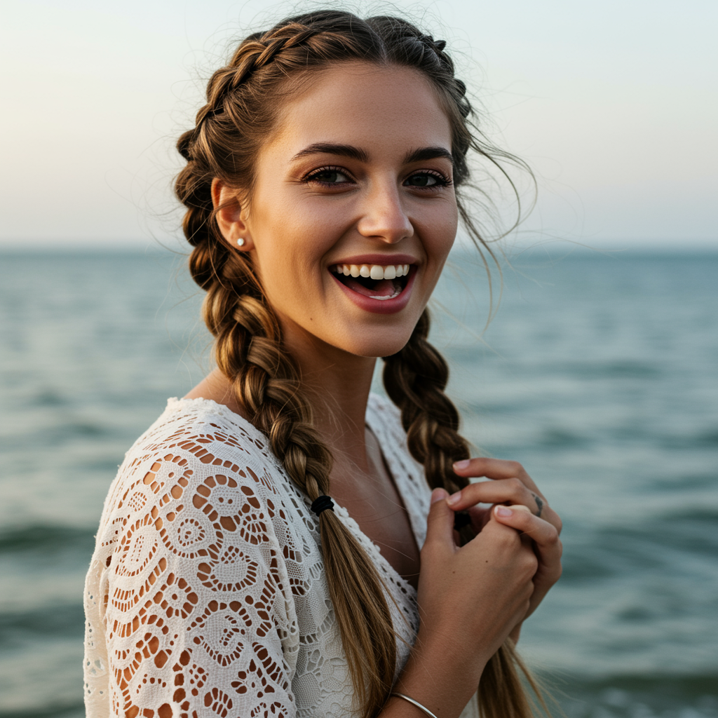A bohemian woman with intricately braided hair stands by the ocean, exuding natural charm. Her bright eyes hold an intense gaze and her joyful face is captured in a candid, dynamic moment. The soft, natural light enhances her enchanting presence as the sea breeze gently plays with her hair.