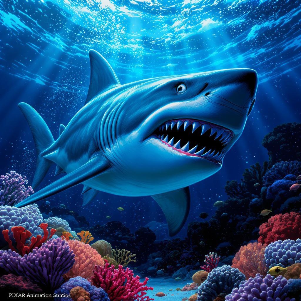 A bold and commanding shark, master of the deep blue, showcasing its razor-sharp teeth and undeniable authority, envisioned by Pixar Animation Studios and Art Spiegelman. The illustration captures a dynamic, dramatic scene beneath the waves, glowing with vivid, powerful strokes, portraying an awe-inspiring marine world. The fearless creature is set against a mesmerizing backdrop teeming with rich colors and captivating marine life, illustrating a raw, untamed underwater realm.