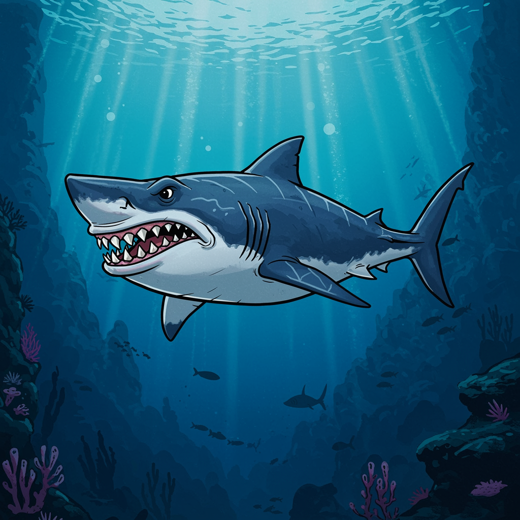 A bold and majestic shark dominating the vast ocean depths, showcasing razor-sharp teeth and an imposing presence, illustrated in the vibrant style of Pixar Animation Studios and infused with Art Spiegelman's unique flair. The scene captures the dynamic motion of the creature as it glides through a dramatic underwater landscape, where beams of light pierce through the deep blue waters, illuminating the rich and mysterious marine environment. The shark's fearless aura exudes power and grace, embodying the spirit of the ocean's untamed ruler.