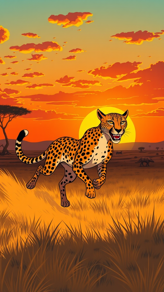 A bold cheetah races across the savannah, its streamlined form cutting through the air with unmatched agility, inspired by Pixar Animation Studios and Art Spiegelman. The scene captures a dynamic illustration set against a breathtaking sunset, where vibrant hues cast dramatic shadows across the landscape, highlighting the cheetah's intensity and grace.