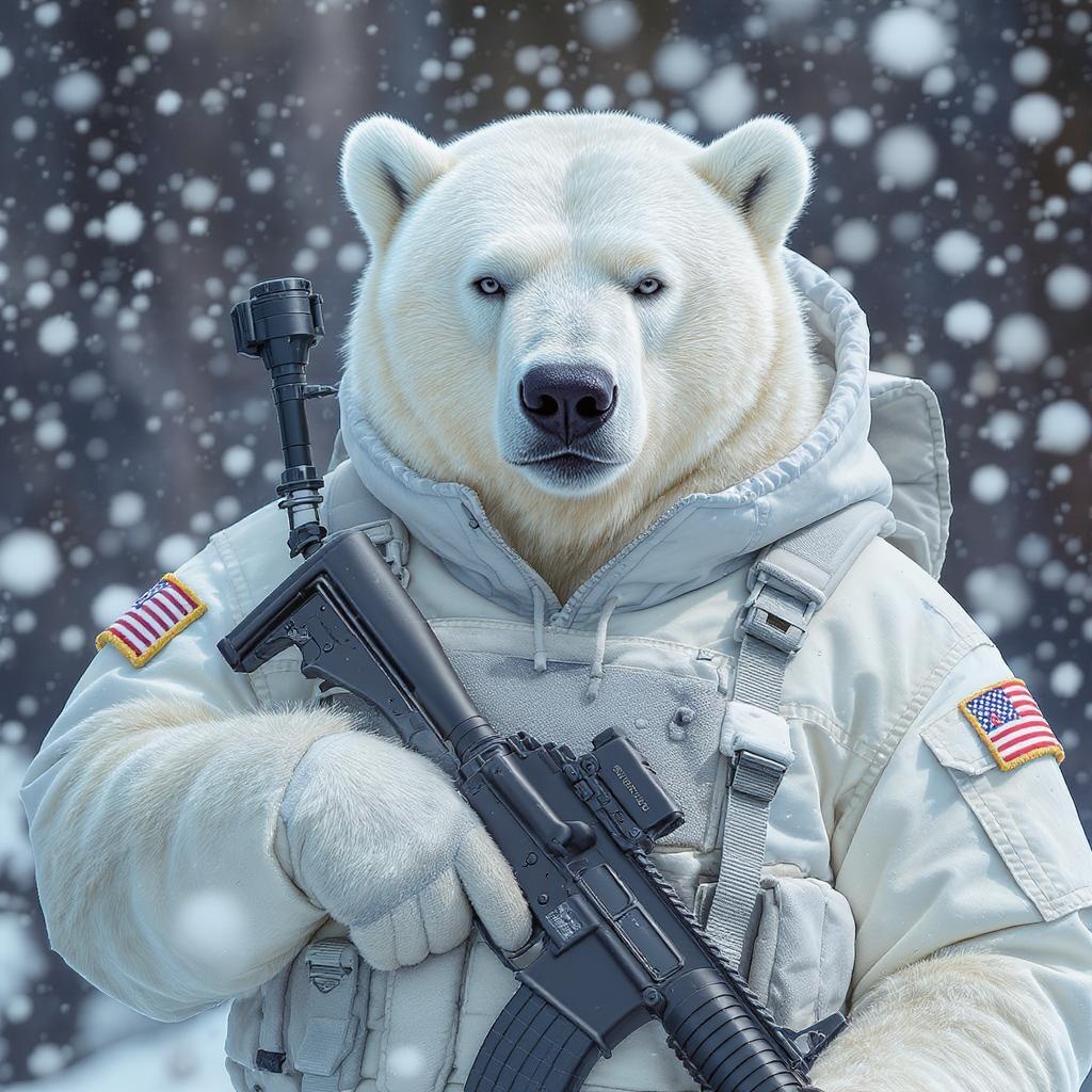 A bold polar bear dressed in a pristine winter military uniform, wielding a sleek carbine rifle, exhibits human-like characteristics, with intricate detailing, ultra-high-definition resolution, 8k quality, capturing lifelike realism, highlighting maximum facial features, cinematographic lighting, portrait aspect --ar 9:16 --q 2 --s 750.