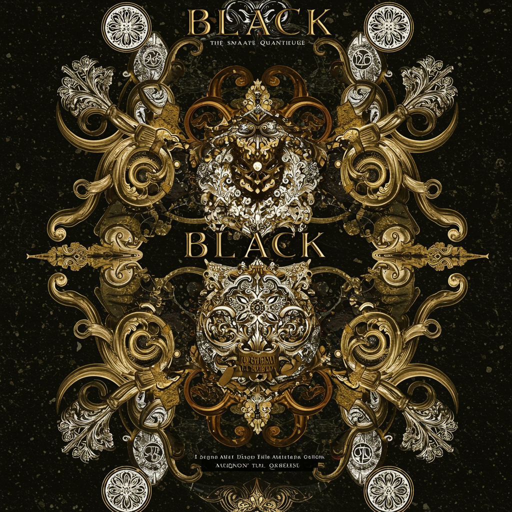A book cover envisioned as an intricate collage blending dark gold and white hues, inspired by ancient art forms. The design incorporates digitally enhanced elements, with foreshortening techniques creating depth and perspective. Tattoo-inspired motifs weave throughout, adding layers of complexity to the textured composition, evoking a sense of mysterious allure and timeless artistry, maintaining the essence of 'black'.