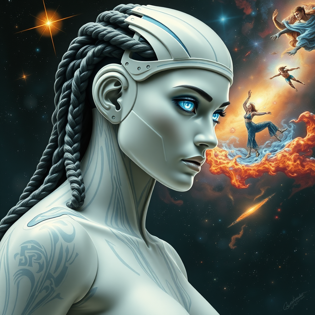 A Botticelli-inspired Birth of Venus painting featuring a pure white, shiny, translucent Egyptian Arab-skinned android adorned with intricate large tribal QR code digital tattoos and sleek cyberware augments, set against a deep sea of stars and vibrant nebulae. The humanoid robot figure has mesmerizing blue crystal eyes and elegantly braided hair. The scene captures the seamless blend of classical art and futuristic elements, immersing the viewer in a celestial display of beauty and innovation.
