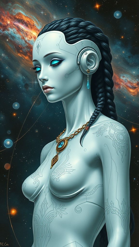 A Botticelli-inspired painting featuring a humanoid android with pure white, shiny translucent skin, reminiscent of Egyptian Arab beauty, adorned with intricate tribal QR code digital tattoos and sleek cyberware augments. The android has striking blue crystal eyes, braided hair, and stands poised against a sprawling backdrop of deep space, filled with stars and vibrant nebulae. The scene evokes a sense of celestial birth, blending classical artistry with futuristic elements, capturing the ethereal beauty of a new age Venus.