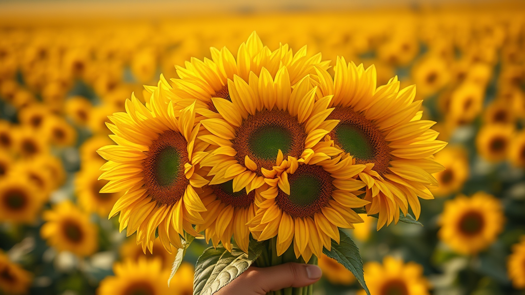 A bouquet of sunflowers held close-up, surrounded by the vibrant expanse of a sprawling sunflower field; the background softly blurred, creating a dreamy atmosphere. The warm golden hues of the sunflowers are highlighted by cinematic lighting, each petal and leaf captured in hyper-realistic detail. The scene is a stunning portrait, evoking a sense of endless summer, framed by the expansive beauty of nature in stunning 8K resolution.