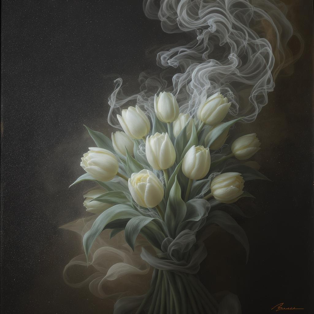 A bouquet of white tulips gently unfurling, surrounded by swirling liquid smoke forming intricate fractals. The scene evokes elegant botany with dynamic movement reminiscent of Raphael and Caravaggio, blending surrealism with a dreamy and hauntingly beautiful atmosphere. The mood is moody and ethereal, capturing the play of light and shadow in an otherworldly setting.