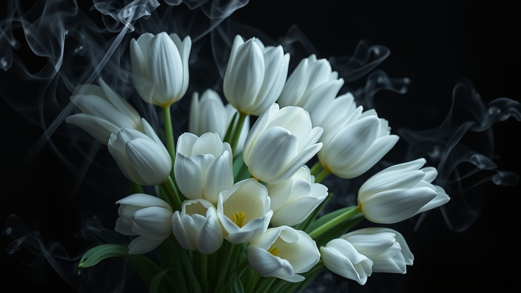 A bouquet of white tulips unfurling in a cascade of liquid smoke fractals, capturing a sense of elegant botany in dynamic motion. Drawing inspiration from the delicate artistry of Raphael and the dramatic chiaroscuro of Caravaggio, the scene embodies a surreal and dreamy atmosphere. Hauntingly beautiful, the composition reveals moody undertones, evoking an ethereal and otherworldly essence.