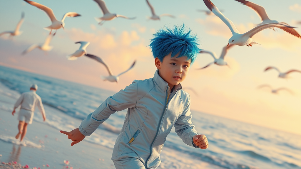 A boy with electric blue hair wearing a cutting-edge suit that morphs in appearance dashes along a virtual shoreline, AI-controlled seagulls soaring overhead. Captured in the style of Rinko Kawauchi, the image showcases naturalistic poses and vacation dadcore vibes, brimming with youthful energy and a cool expression. Infused with cyberpunk aesthetics, the scene features ethereal flowers drifting in the sky. The composition, akin to dreamy lo-fi photography, is vividly colorful and brimming with super detail, shot on Fujifilm XT4, with an analog film-like quality that enhances the vibrant yet surreal atmosphere.
