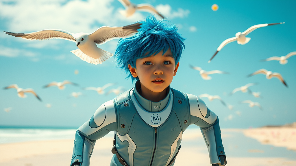 A boy with vibrant blue hair races down a virtual beach in a sleek, technologically advanced suit capable of morphing its appearance. AI-controlled seagulls glide gracefully overhead, their mechanical wings catching the sunlight. The scene is imbued with the essence of Rinko Kawauchi's art—naturalistic poses and an engaging blend of vacation dadcore and youthful energy. His expression is cool and focused as he navigates the cyberpunk landscape, where flowers drift serenely through the sky. The atmosphere captures the dreamy quality of lo-fi photography, with intense detail and a colorful palette reminiscent of analog film. This vivid moment, shot on a Fujifilm XT4, brims with the contrast of nature and technology, exuding an undeniable sense of raw, unfiltered beauty.