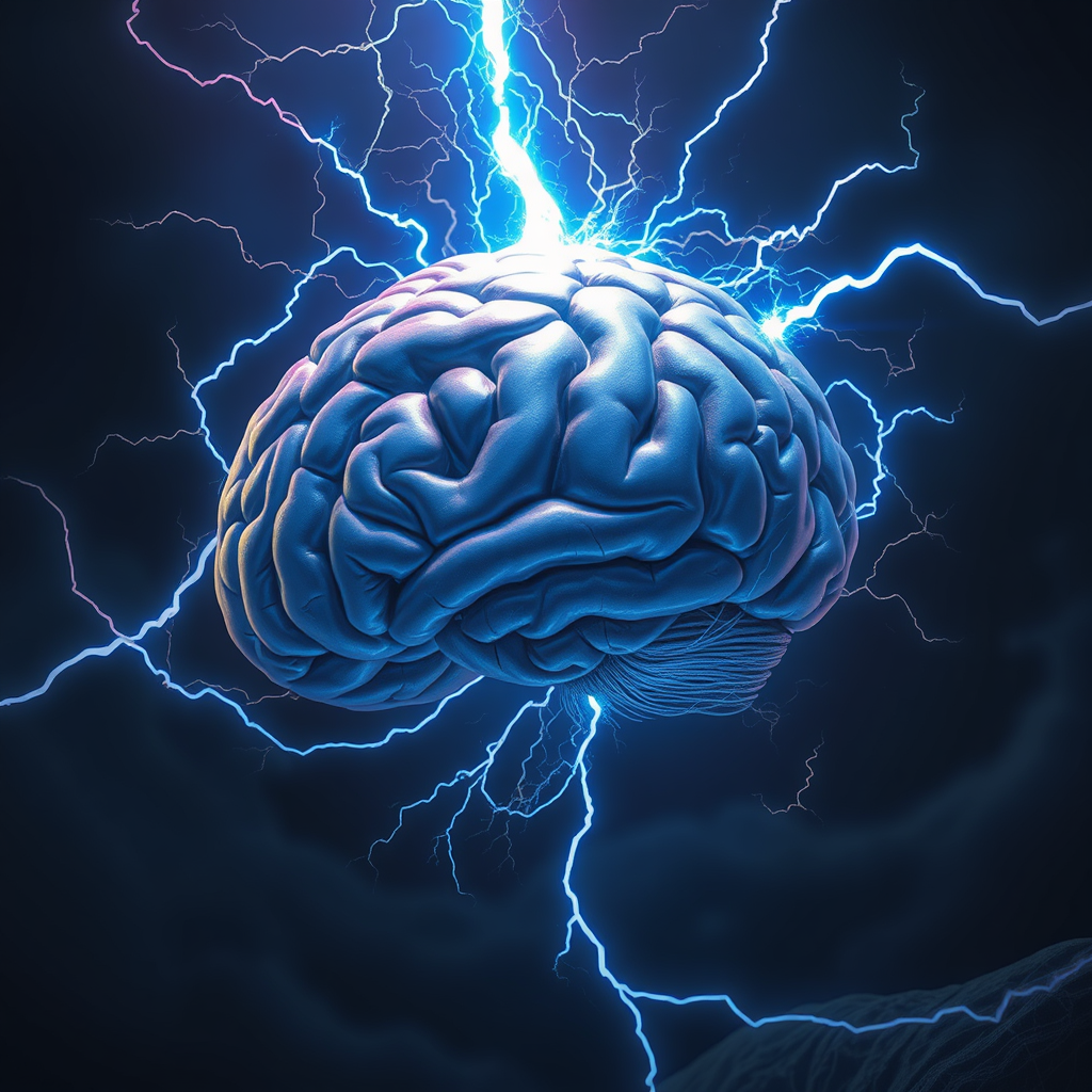 A brain is struck by a neon blue bolt of lightning, transforming into a radiant orb of energy with a metallic sheen. Swirling streams of energy encircle the glowing orb, casting a mystical glow in the dark, mysterious environment. Faint shadows loom in the background, adding to the otherworldly atmosphere. The digital illustration focuses on vibrant colors and intricate textures, creating a fantastical scene with a sense of wonder and awe.