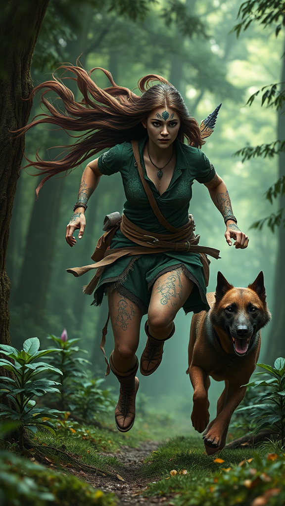 A brave huntress sprints through a dense forest with her loyal hound by her side, her long brown hair flowing behind her. A striking blue tattoo adorns her face, telling stories of her tribal heritage. She is clad in a thoughtfully crafted outfit of green and brown hues, blending seamlessly with the forest surroundings. This intricate digital artwork captures her in a dynamic full-body pose, the details astonishingly vivid in 4k resolution. Inspired by the artistic styles of Dan Mumford, Peter Mohrbacher, and Greg Rutkowski, the fantasy character comes to life with overdetailed patterns, highlighting every contour of her form. Her outfit and the canine companion mirror the landscape's lush tones, reflecting an harmonious connection with nature. This vibrant concept art, trending on ArtStation, invites viewers to dive into an enchanting world where the lines between human and wilderness blur effortlessly.