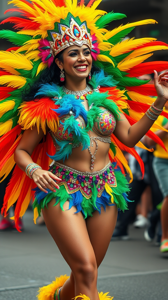 A Brazilian woman in a vibrant carnival costume, adorned with bright feathers and shimmering sequins, radiates an infectious energy and joy. Her outfit is a dazzling array of colors, capturing the spirit of the festivities. Her smile is warm and inviting as she moves with graceful confidence, embodying the lively essence of the carnival. The feathers and sequins catch the light, creating a captivating display that reflects her exuberant spirit and the rhythm of the celebration surrounding her.