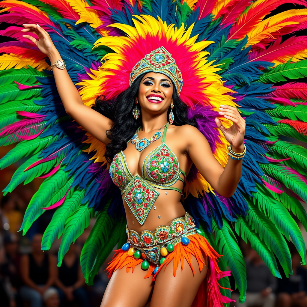 A Brazilian woman radiating joy and energy, adorned in a vibrant carnival costume featuring bright feathers and dazzling sequins. Her dynamic pose captures the essence of celebration, while her radiant smile reflects her contagious happiness. The colorful display and intricate details of her outfit create a mesmerizing visual spectacle, embodying the spirit of Brazil's iconic carnival. Surrounding her is a lively atmosphere, filled with rhythm and movement, enhancing the festive experience. Her confident demeanor and expressive dance bring the scene to life, celebrating cultural richness and exuberance.