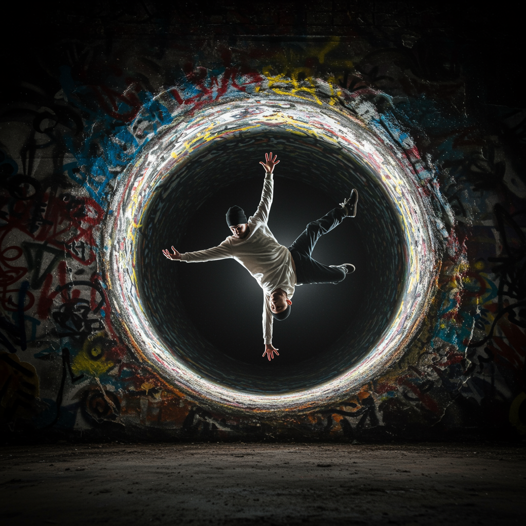A breakdancer soaring through a captivating, enigmatic, and vibrant spray-painted graffiti blackhole, with perfect, expressive eyes, captured in a cinematic masterpiece style. The scene is illuminated with dramatic, cinematic lighting, reminiscent of a classical oil painting by Yoshitoshi. The composition exudes an intense sense of motion and color, blending the dynamic energy of street art with the timeless beauty of traditional art forms.