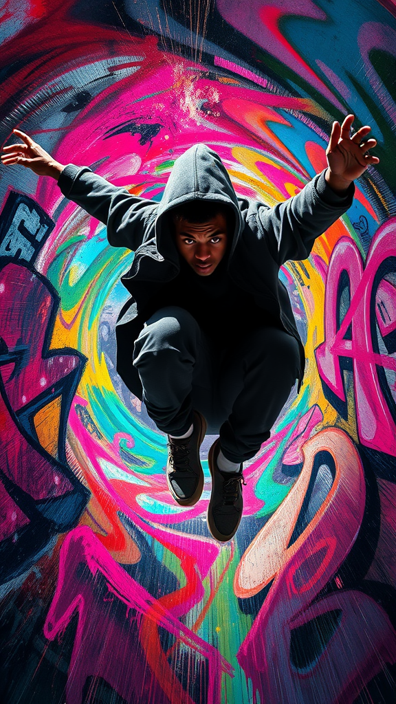 A breakdancer soaring through a vibrant and surreal world of swirling colors, surrounded by an enigmatic, spray-painted graffiti black hole. Their eyes are striking and expressive, capturing a sense of awe and wonder. The scene is illuminated with dramatic cinematic lighting, reminiscent of a classical oil painting by Yoshitoshi. The composition is both a visual masterpiece and a dynamic capture of movement, with an imaginative twist that suggests the presence of a hidden, mysterious realm within the abstract graffiti universe.