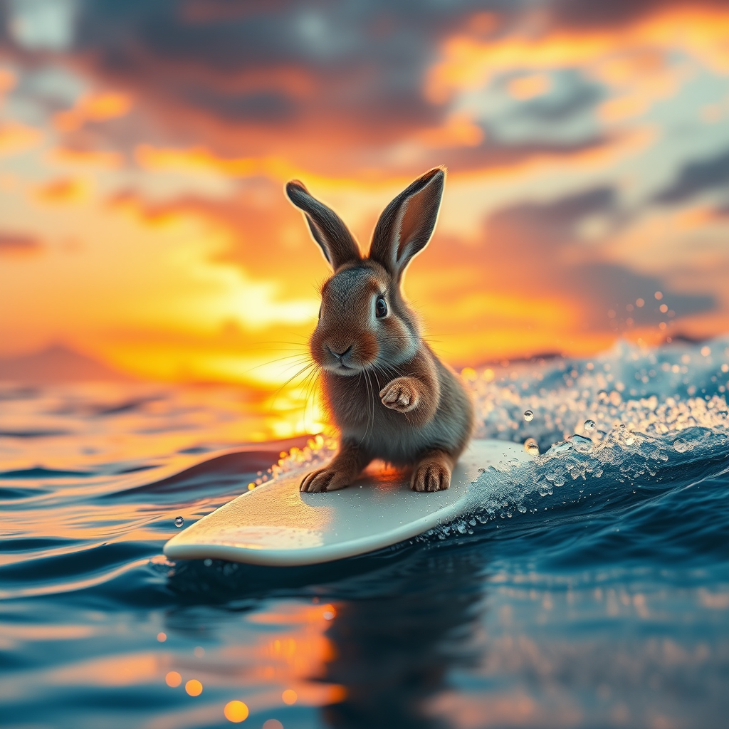 A breathtaking 32k photorealistic image of an adorable baby bunny skillfully surfing a shimmering wave at sunset, bathed in cinematic lighting with hues of golden orange and pink reflecting off the water, tiny droplets suspended in the air around the bunny, its fur subtly catching the warm sunset glow, the entire scene exuding a whimsical and adventurous vibe against the backdrop of a vibrant, colorful sky.