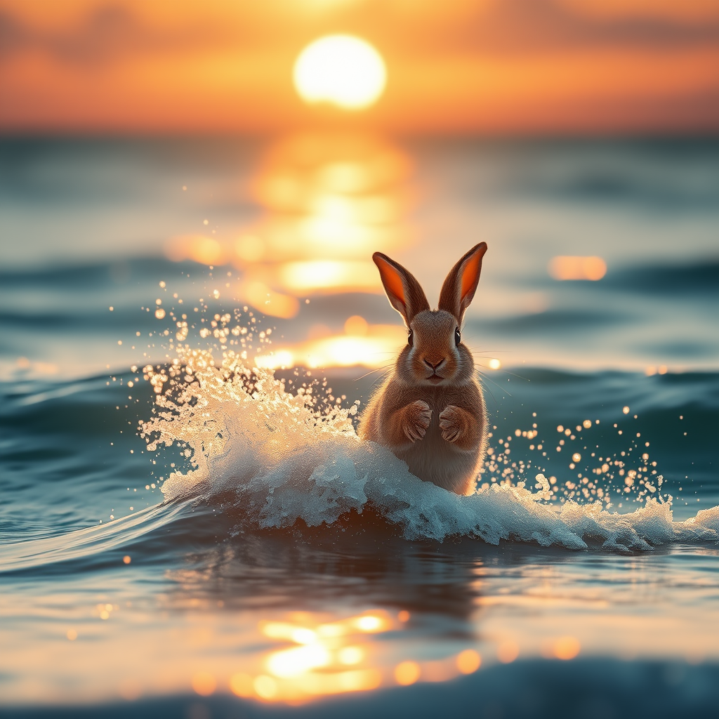 A breathtaking 32k photorealistic scene features a playful baby bunny skillfully riding a wave, bathed in cinematic lighting. The sun is setting, casting a golden glow over the ocean waters. The horizon is tinged with hues of orange and pink, contrasting with the sparkling blue of the sea. Gentle sprays of water catch the light, creating a shimmering effect around the joyful bunny. Its fur glistens in the fading sunlight, and the bunny's eyes reflect the colors of the sky, adding a touch of magic to this captivating moment.
