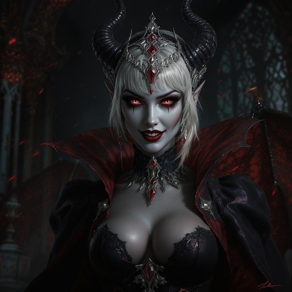 A breathtaking 4k digital painting of a captivating Lady Dracula, exuding an air of both allure and mystery. Her face is an exquisite blend of cuteness and mischief, highlighted by sharp, gleaming teeth. She sports short platinum blonde hair adorned with intricate, elaborate headgear. Drawing inspiration from Coppola's Dracula and the evocative style of artists like Artgerm and Greg Rutkowski, this image shines with extreme detail and cinematic prowess. Her figure stands centered, enveloped by the atmospheric depth typical of vampire horror films. The setting is richly detailed, with dramatic, realistic shadows and a dark, moody ambiance. Enhanced by overcast reflection mapping and meticulously applied VFX post-production, the depiction achieves an ultra-photorealistic quality. This piece could be mistaken for an award-winning photograph shot on a Nikon Z9, utilizing Unreal Engine 5 and Redshift render for remarkable 8k realism. The sophisticated lighting includes TX ray tracing and spotlight effects, combining to produce a scene of epic, hyper-realistic drama and intensity.