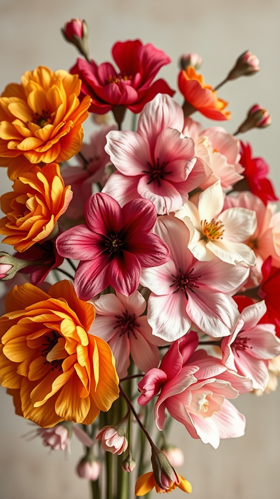 A breathtaking 8k high-resolution photograph captures a delicate arrangement of blossoms displayed as a masterpiece of art nouveau. The flowers burst with vibrant and exquisite beauty, featuring hues of golden ochres, deep crimson reds, rich violets, and soft muted pinks. Crafted from a mix of crumpled paper and delicate silk, each bloom adds a unique texture to the arrangement. Professionally color graded with a front-facing angle, the image is taken with f/1.4 aperture using a 50mm lens, highlighting the intricate details with a dreamlike, ethereal quality.