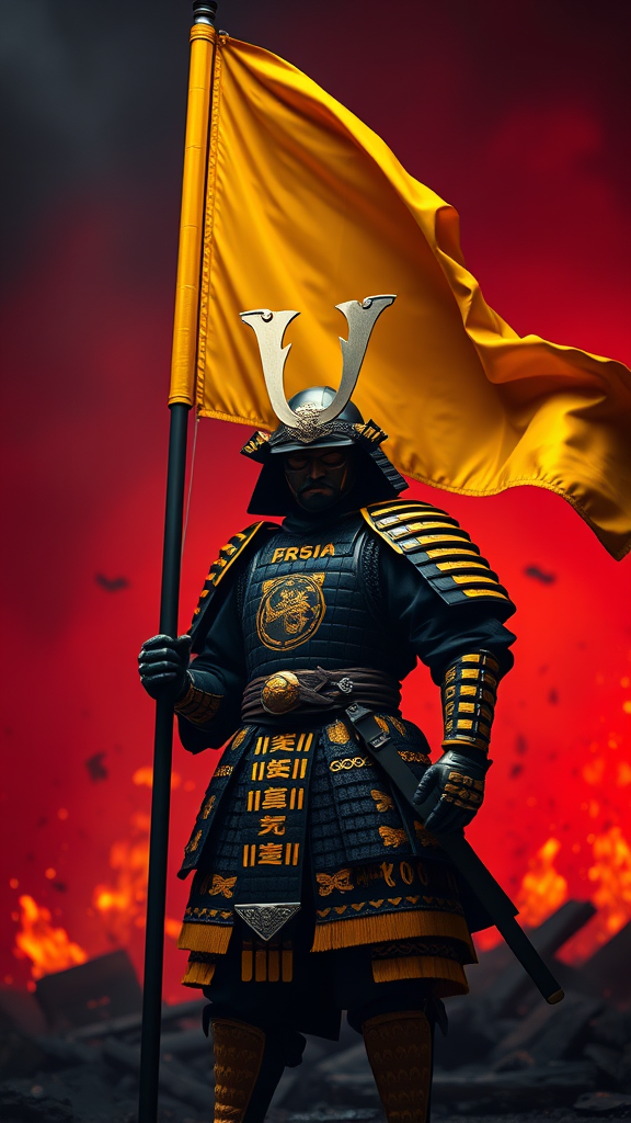 A breathtaking 8k ultra-realistic image of a samurai warrior standing tall with a striking yellow war flag banner, showcasing a full-length view. The warrior is adorned in intricate yellow and black armor, with ornate cinematic lighting highlighting the high-definition, vibrant details. The scene is hyperrealistic with intense focus, rendered with Unreal Engine 5, creating a dark ambiance with lumen reflections. Depth of field enhances the photography, set against a reddish war-torn backdrop filled with swirling smoke and glowing embers, capturing a sense of epic cinematic drama.