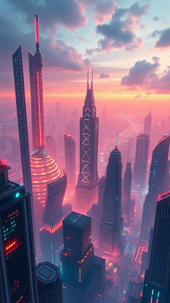 A breathtaking and expansive view of the city's grand and futuristic architecture, showcasing a sense of scale and immensity, illuminated with vibrant and pulsating energy, exuding enigmatic technology, 3D rendering, trending on Pinterest and Tumblr, art inspired by the styles of Vitaly Bulgarov, Jama Jurabaev, Maciej Kuciara, Raphael Lacoste, and Alex Roman, minimalistic elements, abstract forms, dynamic composition, ethereal atmosphere, captivating details, intriguing silhouettes.