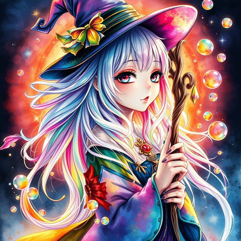 A breathtaking and exquisitely intricate illustration featuring a stunning girl with a mystical aura. Her platinum hair flows with fluid grace, streaked with a mesmerizing array of colors. She wears a bewitching hat, perched charmingly atop her head, as she holds an enchanting staff that seems to pulse with magical energy. Her eyes, vibrant and full of life, reflect a kaleidoscope of colors, drawing you into their spellbinding depths. Her attire, a blend of multicolored fabrics, shimmers with every movement as if woven from the very essence of a rainbow. She stands bathed in the gentle glow of sunlight, surrounded by iridescent bubbles that float around her like playful spirits. The scene is alive with vivid splashes of color, capturing the essence of Halloween and the ethereal beauty of the world she inhabits. Her presence is a harmonious blend of enchantment and elegance, a masterpiece brought to life with rich, detailed watercolor artistry.