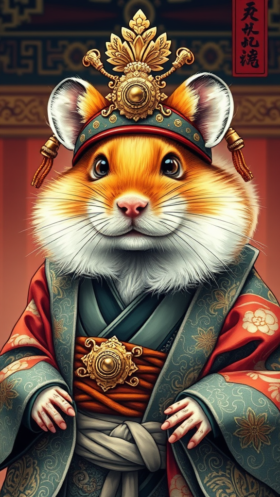 A breathtaking and highly detailed portrait of a hamster dressed as a feudal Japanese emperor, inspired by the styles of Carne Griffiths and Conrad Roset. The composition is centered and key visual elements include intricate, precise line art and vibrant colors, capturing the essence of traditional Japanese attire with a cinematic touch. The hamster's regal expression is intricately depicted, with an emphasis on ornamental details and the rich textures of silk and brocade. The background suggests an imperial setting, enhancing the hamster's majestic pose. Despite its photorealistic and high-definition qualities, the composition avoids any errors such as poor anatomy, extra digits, or disfigurements. It maintains artistic clarity without any presence of text, artifacts, or watermark signatures, ensuring a pure, undistorted visual experience.