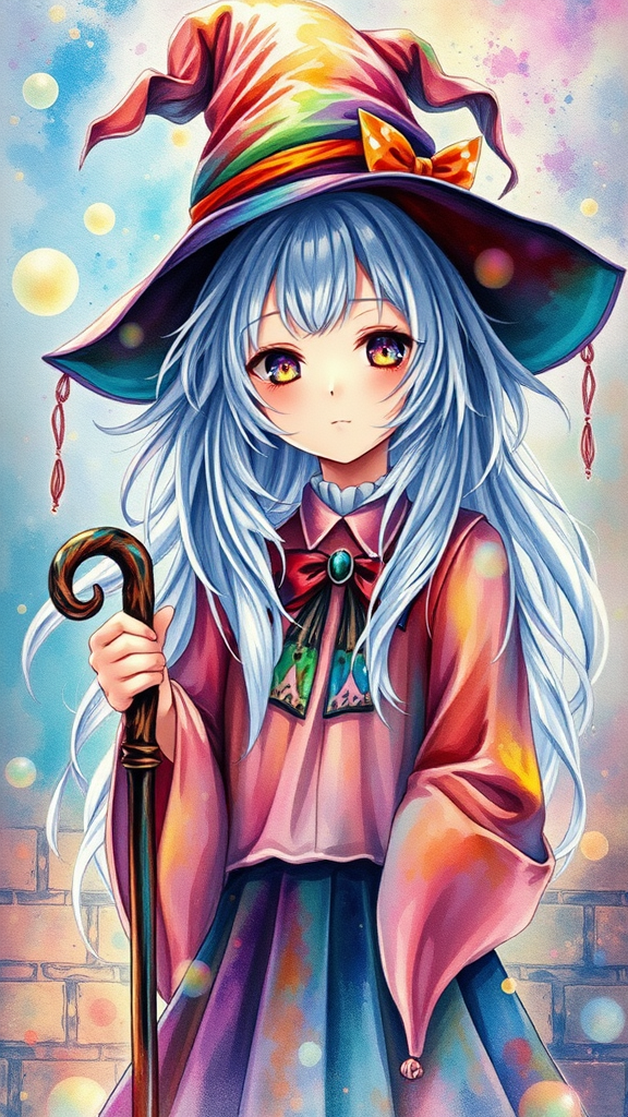 A breathtaking and intricate masterpiece, of the finest quality and exquisite detail, featuring a stunning illustration with magnificent and vibrant graphics. The scene captures a realistic yet ethereal watercolor of a girl with flowing, disheveled, and liquid-like platinum hair, enriched with multicolored streaks. She stands solo, exuding a captivating presence, wearing a charming witch hat and grasping a mystical cane. Her vibrant, multi-hued eyes, full of life and mystery, draw you in with their beauty. Her attire is a kaleidoscope of colors, reminiscent of a Halloween dream, shimmering brilliantly in sunlight. Encased by a kaleidoscope of vivid bubbles and a colorful background, this high-saturation artwork is surrounded by dynamic and lively splashes of color, creating an enchanting and magical atmosphere.
