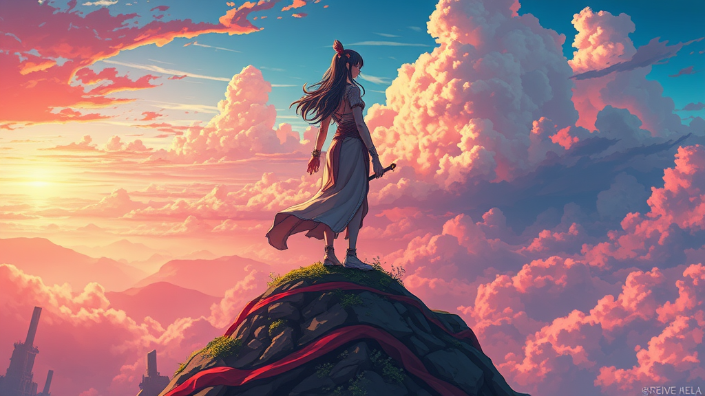 A breathtaking and vibrant poster depicting a warrior goddess standing alone atop a hill, captured in anime style. She is centered against a panoramic landscape, exuding strength and serenity. The key visual showcases intricate details, merging the artistic influences of Carne Griffiths, Conrad Roset, and Makoto Shinkai. The scene is rendered in a cinematic style, with a harmonious blend of vibrant colors that bring the goddess and her surroundings to life.