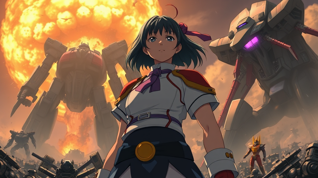 A breathtaking Anime epic featuring an incredibly powerful girl at its heart, envisioned by Hideaki Anno, Katsuhiro Otomo, and Rumiko Takahashi. This box office sensation, a storytelling masterpiece, centers around the awe-inspiring main character, whose presence dominates the scene. Surrounding her, an epic clash unfolds between formidable monsters and towering mech creatures, their combat painting an intense backdrop. The sky is ablaze with cataclysmic nuclear explosions, creating a visually stunning and highly detailed 8k masterpiece. The atmosphere is charged with energy and drama, drawing audiences into a world where power and emotion collide in an unforgettable cinematic journey.
