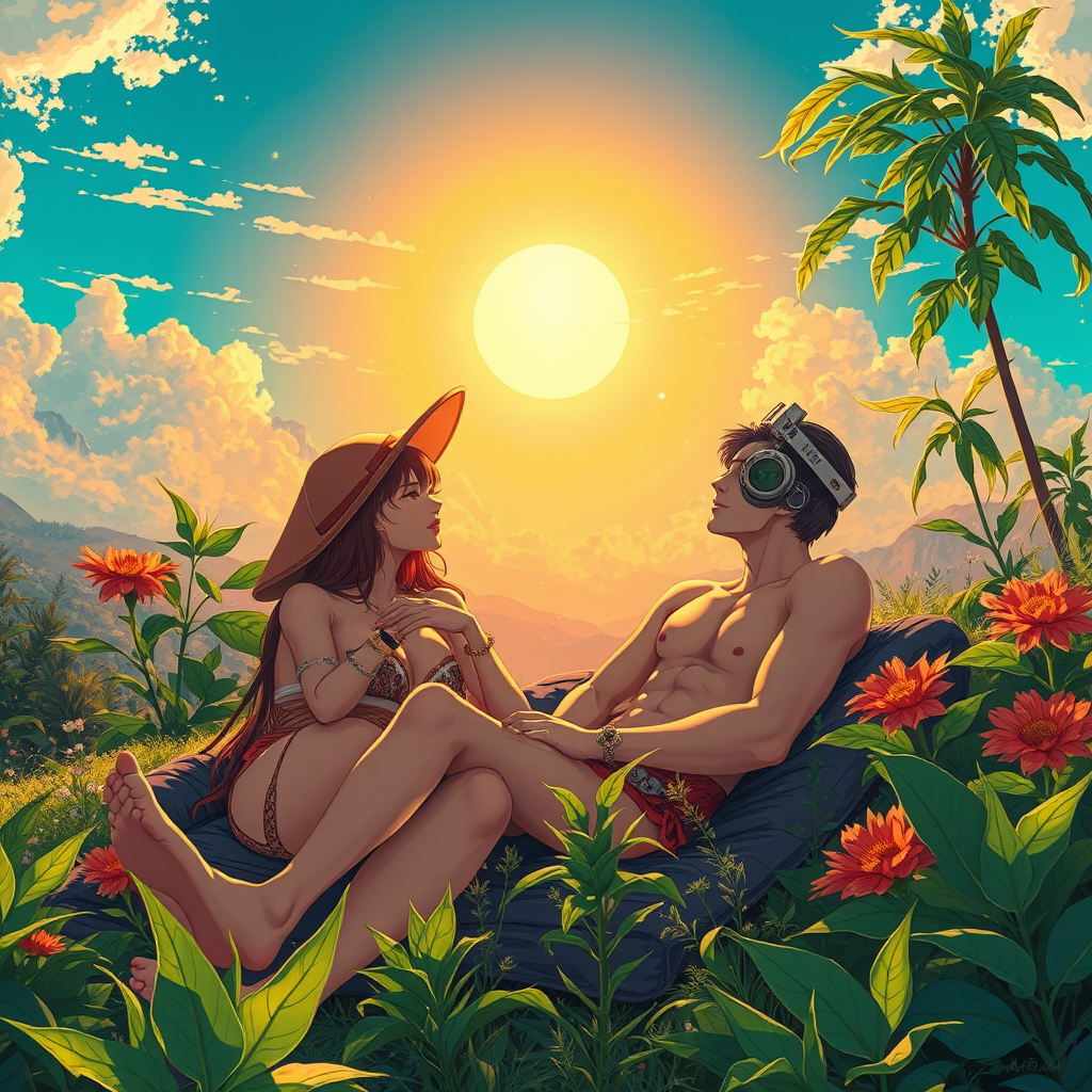 A breathtaking anime painting capturing a solarpunk summer relaxation, inspired by the styles of Tim Okamura, Victor Nizovtsev, Greg Rutkowski, and Noah Bradley. The scene is vibrant and alive, celebrated on Artstation, featuring an 8k resolution masterpiece. The piece is intricately detailed and saturated with colors, showing intricate nuances and the harmony of the golden ratio. Elements of urban graffiti art blend effortlessly with fine art techniques, creating a stunning visual that is both futuristic and deeply connected to nature. The soft glow of the sun bathes the landscape in warmth, while verdant plants interlace with sleek technology, embodying a harmonious fusion of natural and human innovations.