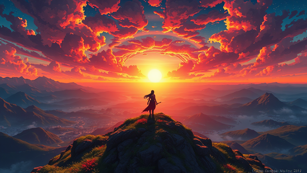 A breathtaking anime-style poster featuring a warrior goddess standing in solitude atop a majestic hill. She is perfectly centered in the composition, exuding strength and grace. The artwork is richly detailed, drawing inspiration from the intricate styles of Carne Griffiths and Conrad Roset. The vibrant colors and panoramic view evoke the cinematic magic of Makoto Shinkai. This key visual boasts stunningly intricate details, capturing the goddess in a moment of serene power against a vivid and expansive landscape.